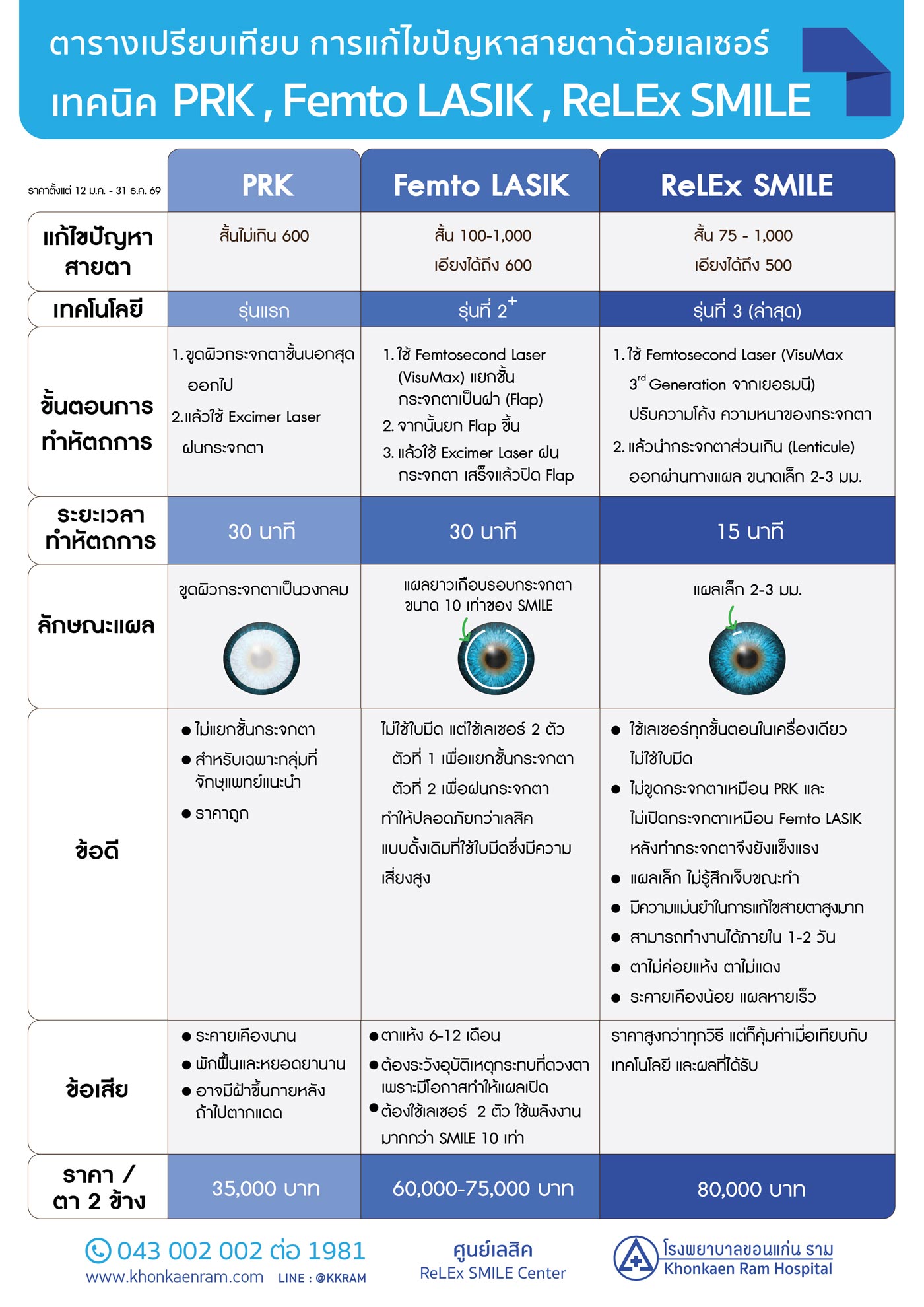 มี 3 วิธีหลัก คือ PRK, FemtoLASIK และ ReLEx SMILE