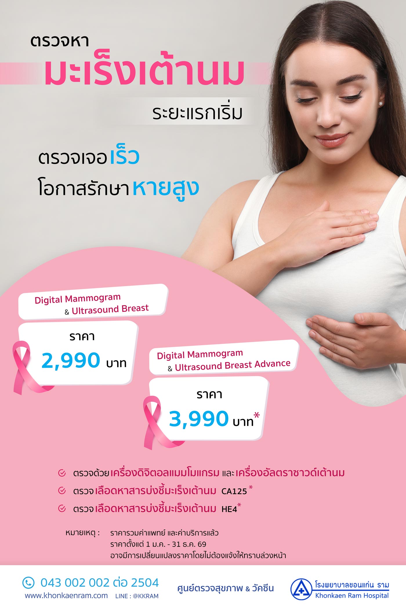 - อายุ 35 ปีขึ้นไปตรวจแมมโมแกรมเป็นข้อมูลพื้นฐาน อายุ 40 ปีขึ้นไปตรวจแมมโมแกรมทุกปี