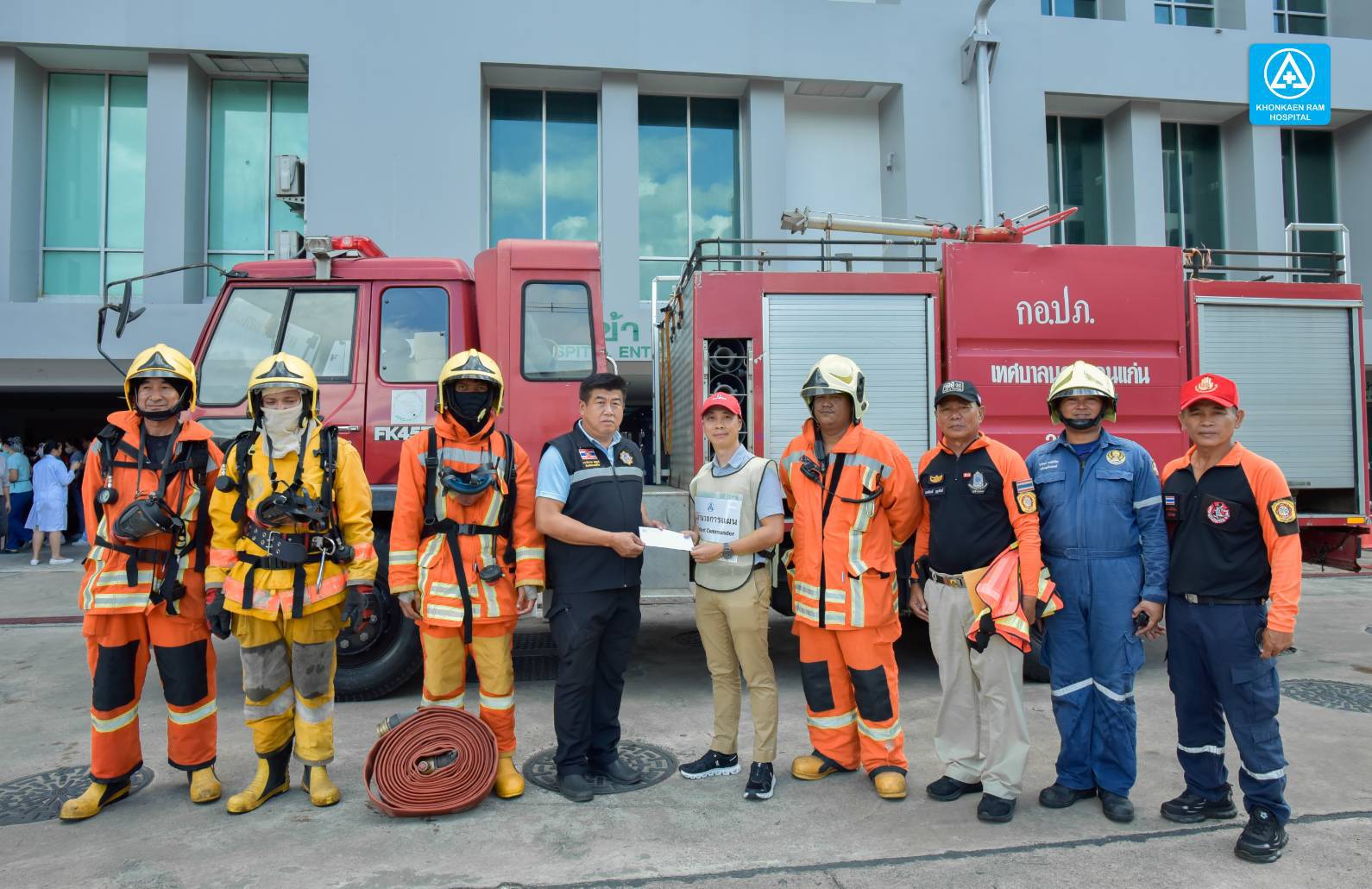 โรงพยาบาลขอนแก่นรามได้รับเกียรติและความอนุเคราะห์จากเทศบาลนครขอนแก่น ที่ได้สนับสนุนรถดับเพลิงและทีมเจ้าหน้าที่ผู้เชี่ยวชาญเข้าร่วมปฏิบัติการในสถานการณ์จำลอง เพื่อสร้างความสมจริงและเสริมสร้างความเข้าใจในการทำงานร่วมกันอย่างไร้รอยต่อ นอกจากนี้ ยังได้รับความร่วมมือจากผู้ชำนาญการจาก เทศบาลตำบลกุดน้ำใส อ.น้ำพอง ในการร่วมวางแผน สังเกตการณ์ และประเมินผล เพื่อนำข้อเสนอแนะมาพัฒนาแผนให้มีประสิทธิภาพยิ่งขึ้นต่อไป